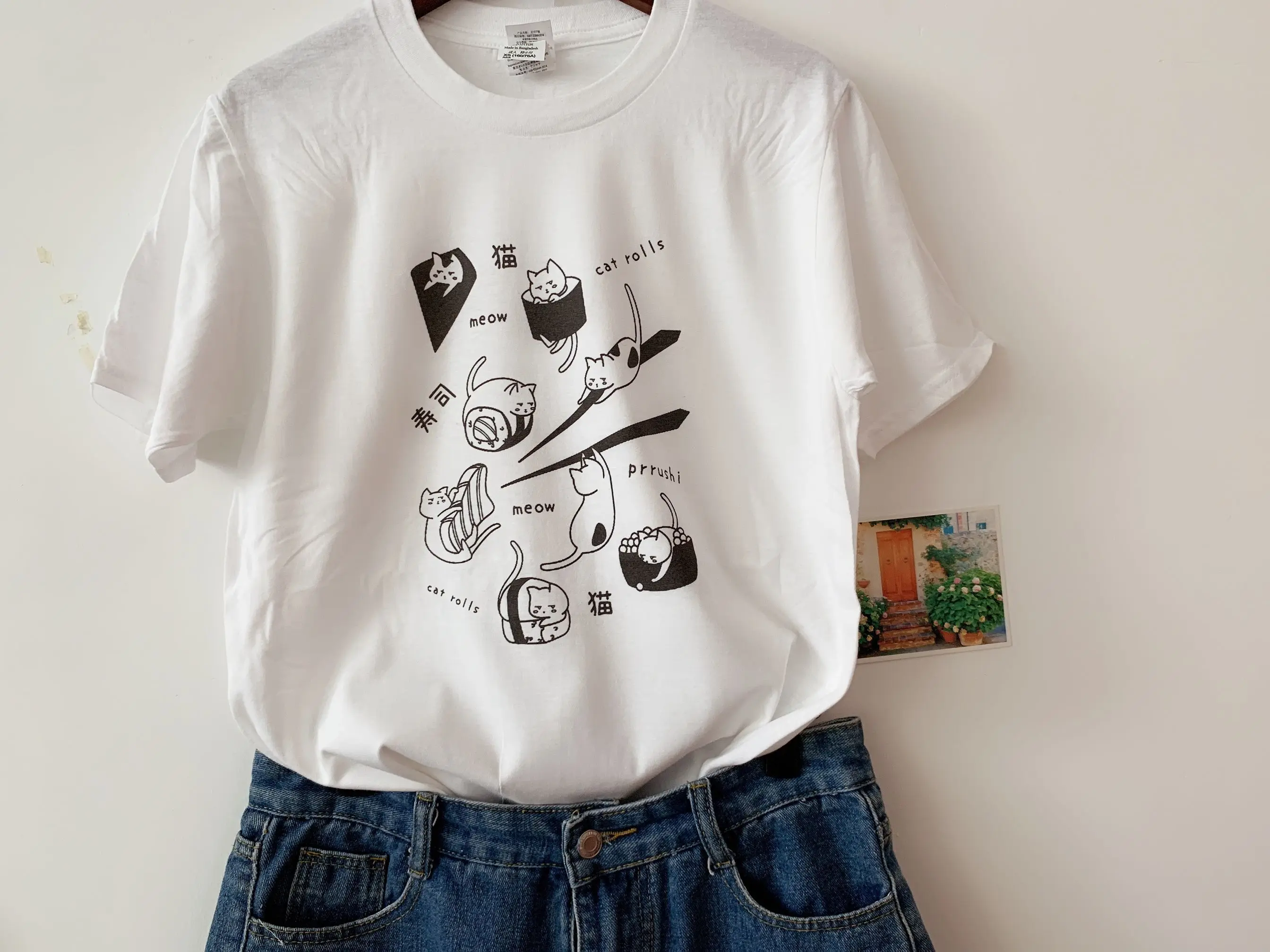 BEST PUDO-XSX Japan Sushi Cat Lazy T-shirt Women's Funny New Cotton T Shirts Kittens Food T-Shirt Womens