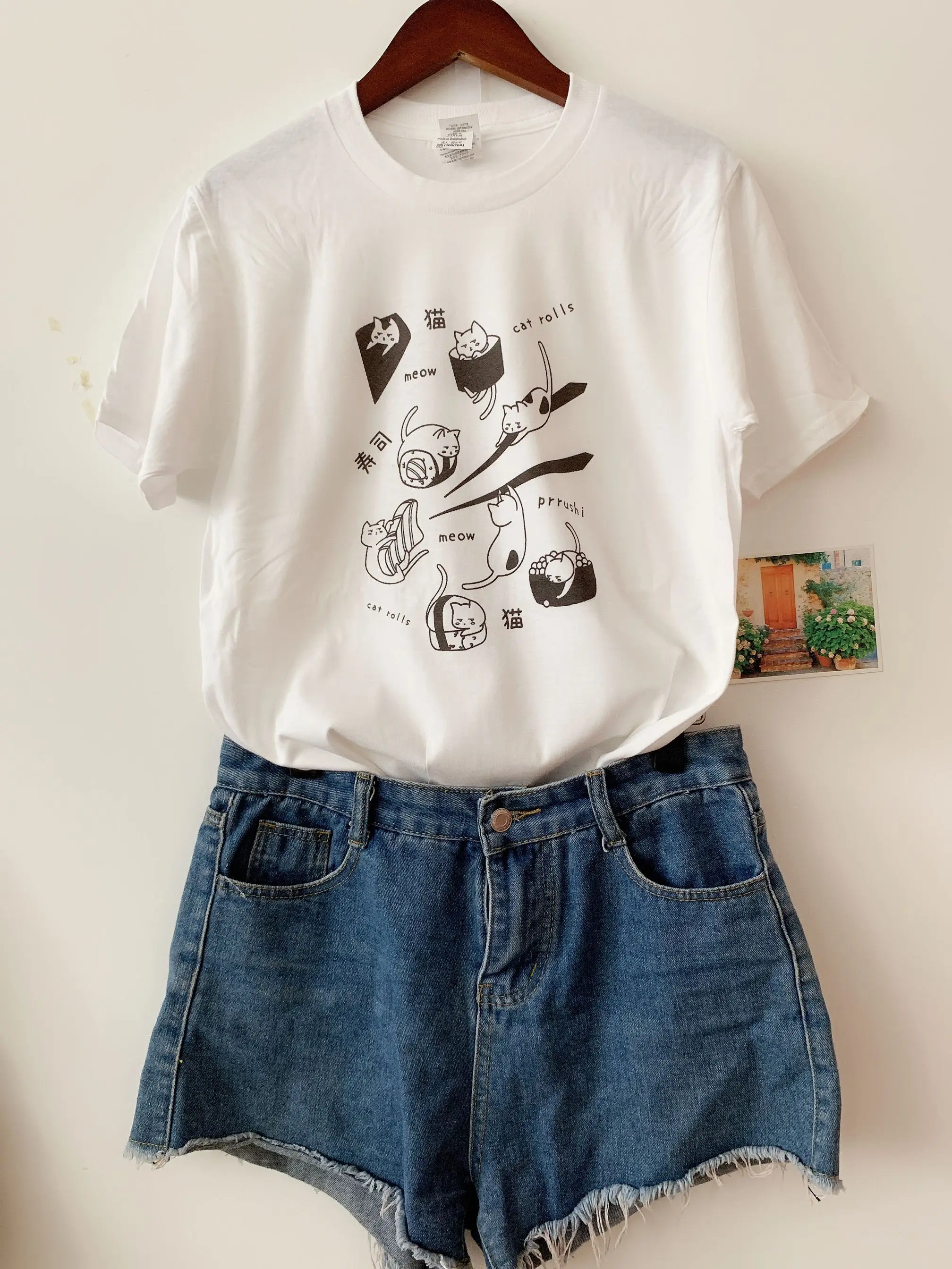 PUDO-XSX Japan Sushi Cat Lazy T-shirt Women's Funny New Cotton T Shirts Kittens Food T-Shirt Womens